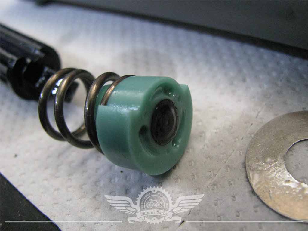 Зеленая заглушка — запорный клапан демпфера, который определяет будет вилка заблокирована или нет. Пазы в его нижней части скользят по трем упорам в самой нижней части демпфера. В этой версии демпфера эти три упора отлиты вместе с корпусом демпфера.