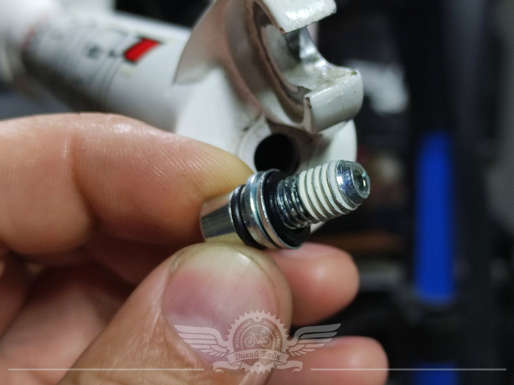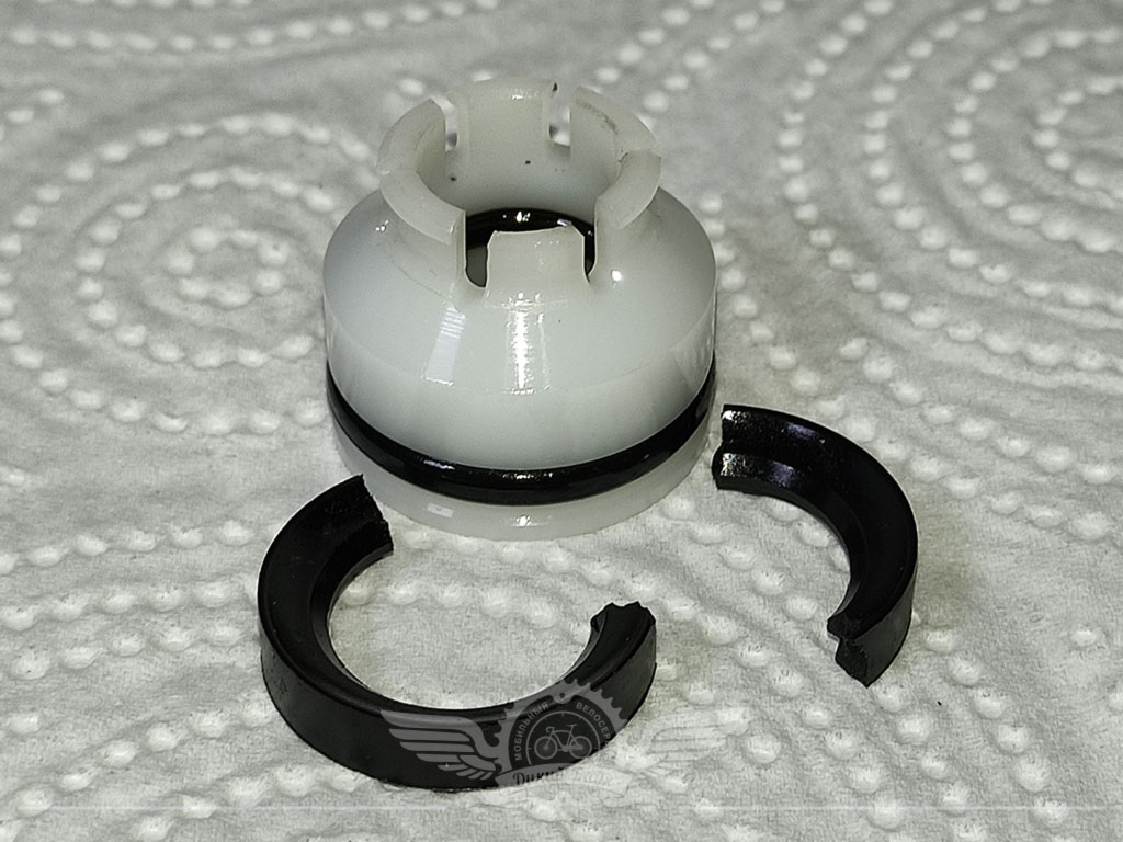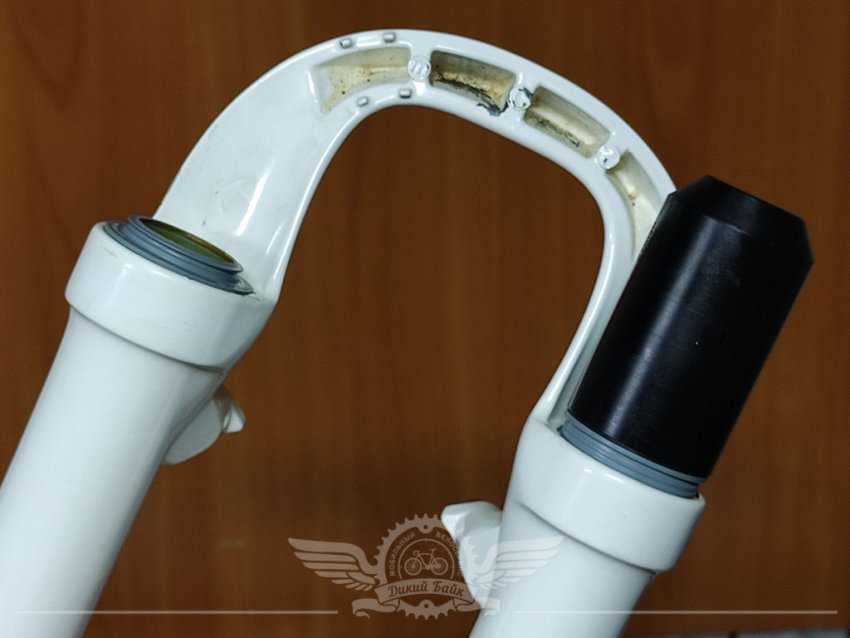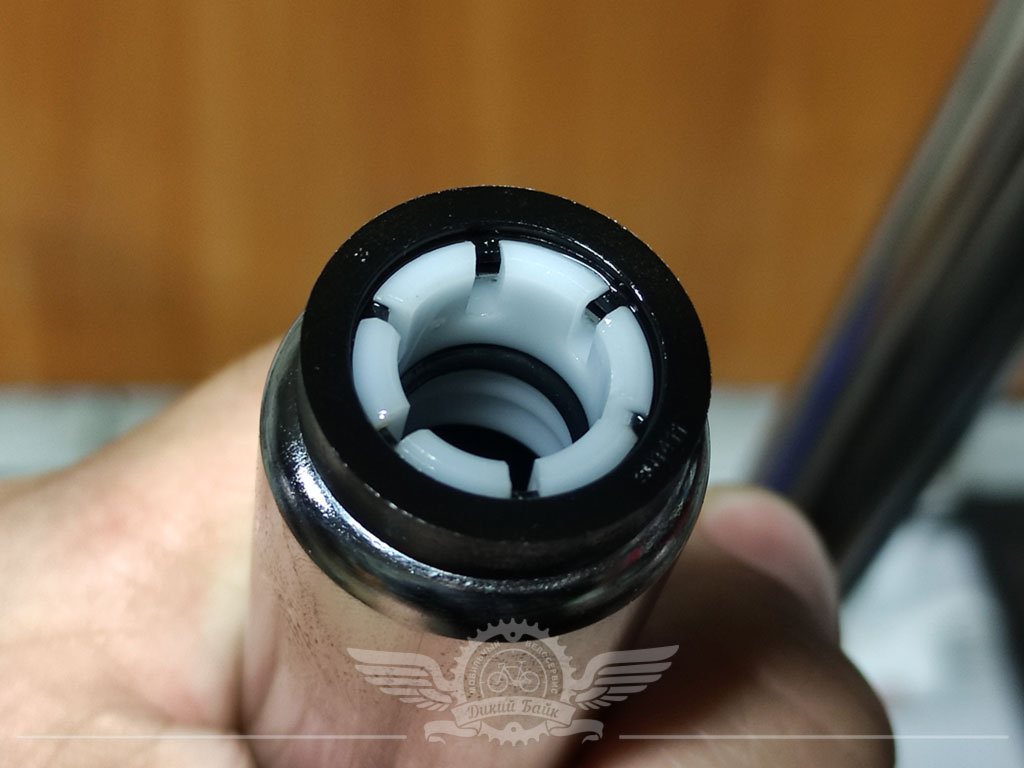 На фотографии видна поломка. Так вот о-ринг (резиновое колечко ) прохудилось со временем и масло из демпфера перетекло в штаны вилки. И все бы ничего, но ближайшая хорошая ямка и зубы фиксатора обломало. Так вот это злополучное, удерживающее масло пластиковое кольцо с о-рингом внутри — направляющая демпфера отскока, отдельно не продается, а идёт запчастью вместе с демпфером отскока. Естественно увеличивая стоимость. Так что все же дешевле обслуживать вилку хотя бы раз в сезон. Благо в случае с этой вилкой ноги вилки были целые. Они стальные, а вода не успела попасть внутрь. Смотрите другие фото ниже :)